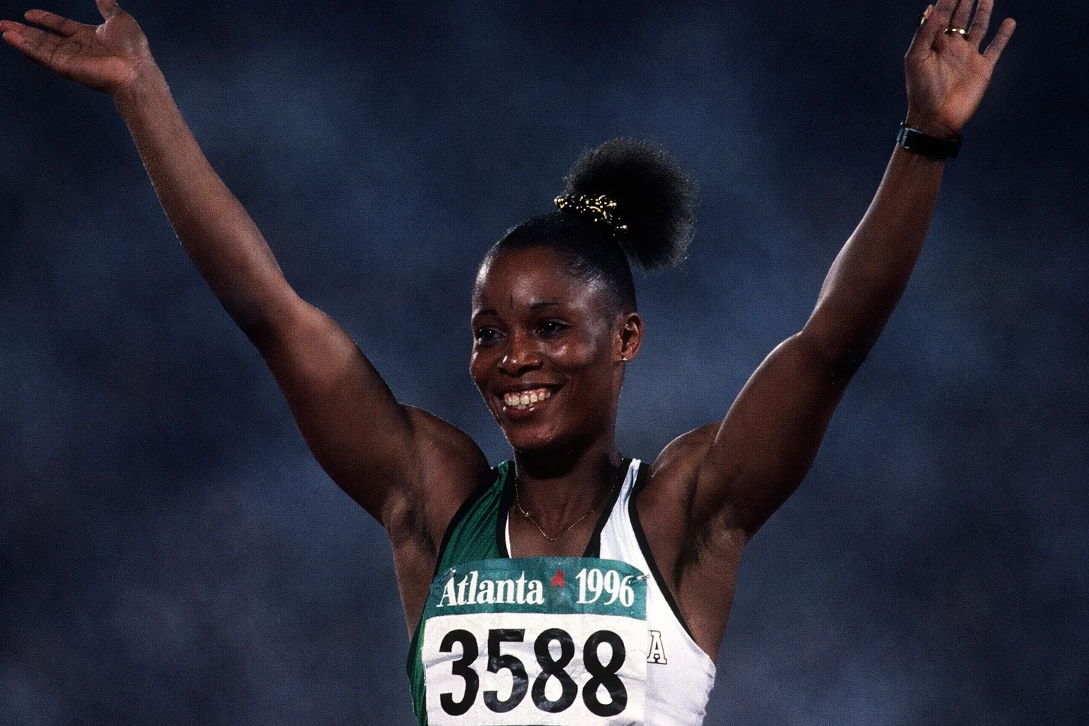 In 1996, she won Olympic gold in the long jump in Atlanta with a 7.12-metre jump. She became the first Nigerian to win an individual Olympic gold medal and the first Black African woman to win gold in a field event.